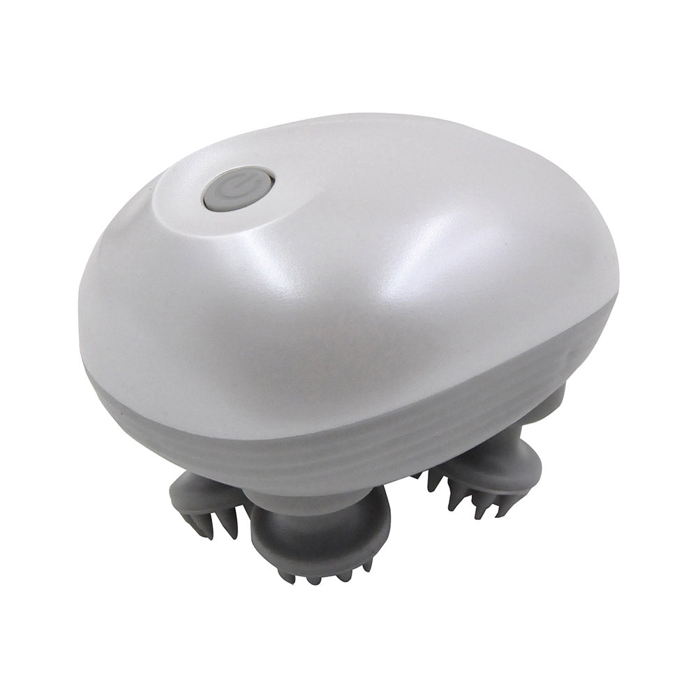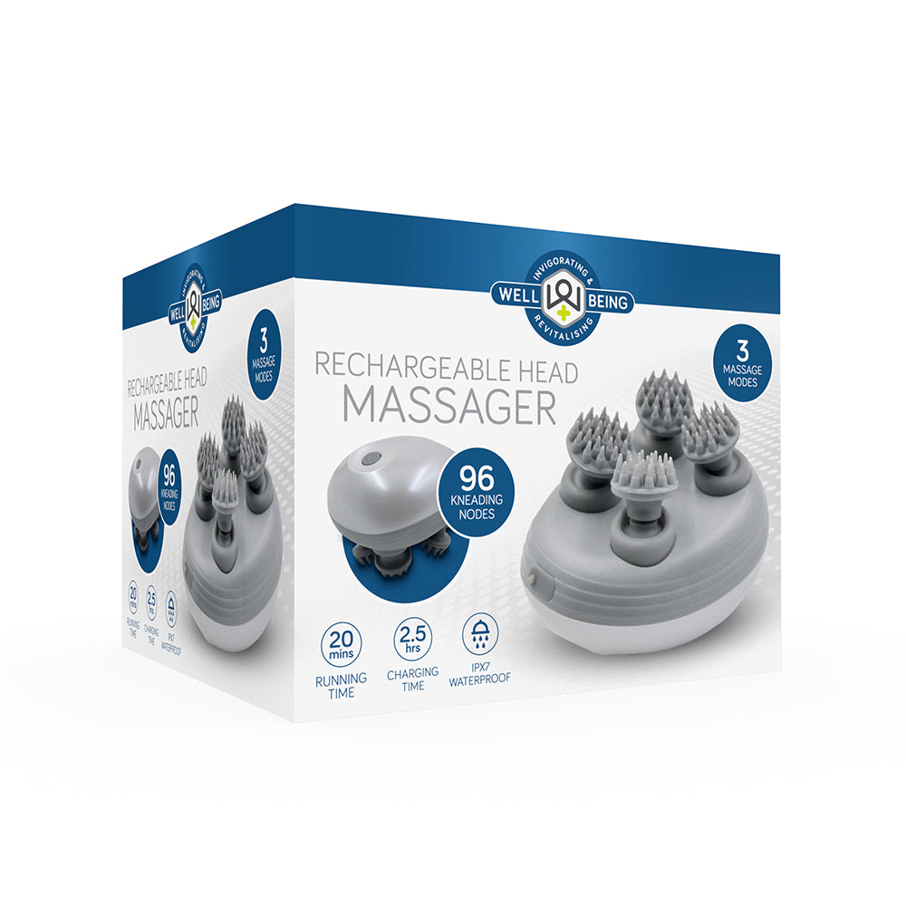A rechargeable handheld head massager with 3 massage nodes, 20 minutes of runtime, and a 2.5-hour charging time.
