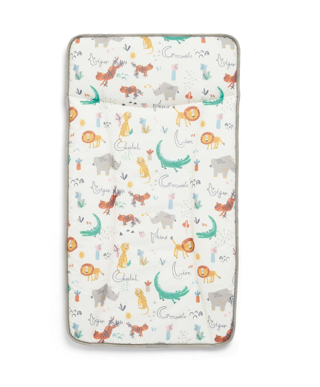 Shaped and padded for their comfort as you change their nappy or dress them. Made from 100% recycled polyester and recycled nylon binding. In a playful jungle print on soft white background with green binding.