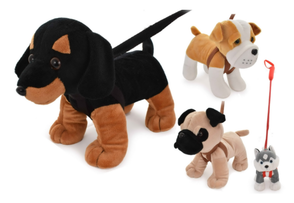 Each dog has its very own stiff lead so you can take them for a walk. There are 4 different breeds available which are Husky, Pug, Bulldog, and Rottweiler. Each companion has its very own lead and harness collar and measures at approx. 30cm.