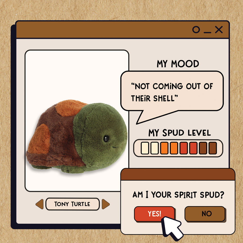 Meet Spudsters Tony Turtle Soft Toy, the plush turtle with a twist from our beloved Spudsters Collection. Tony's potato-shaped form is as unique as it is huggable, featuring a soft green shell accented with brown patches and an irresistibly cute face. Crafted from premium, soft materials, Tony is ready for a lifetime of cuddles and adventures.