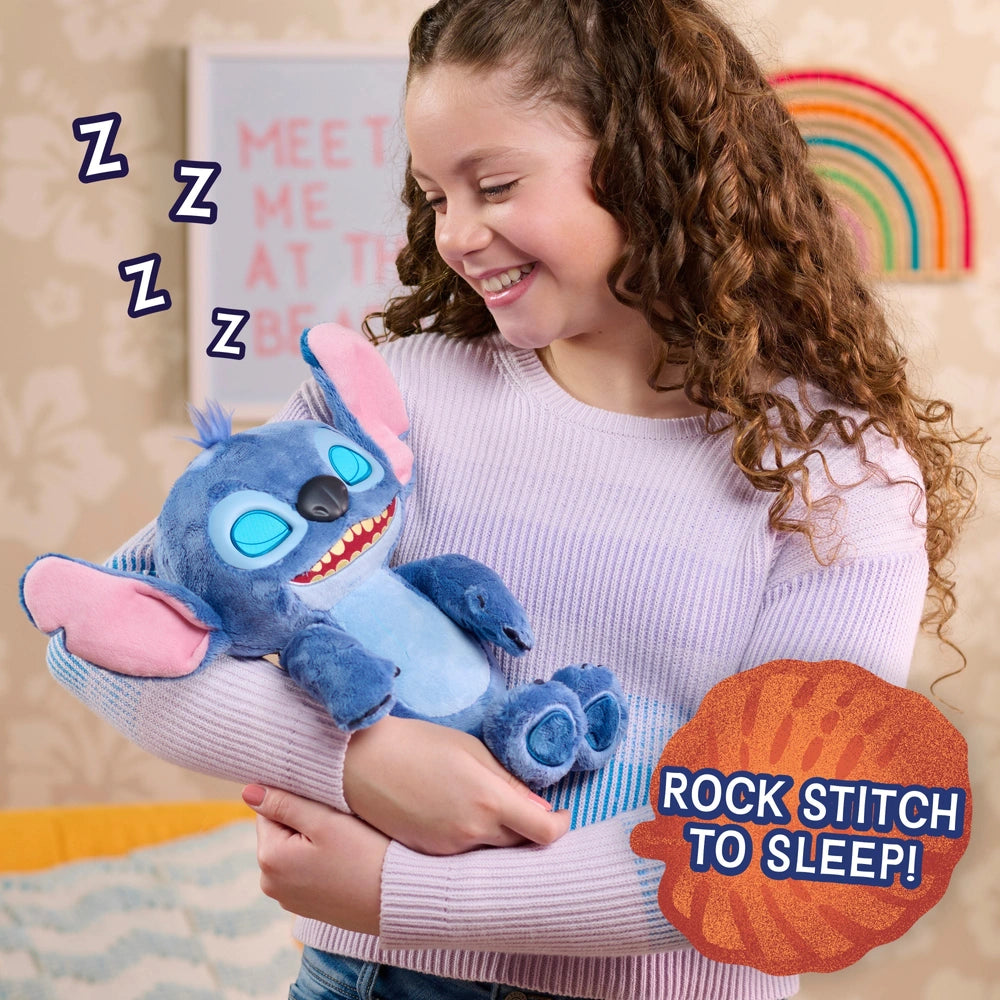 - Gently rock Stitch to hear adorable yawns and snores as his eyes close, making him a sweet companion for bedtime