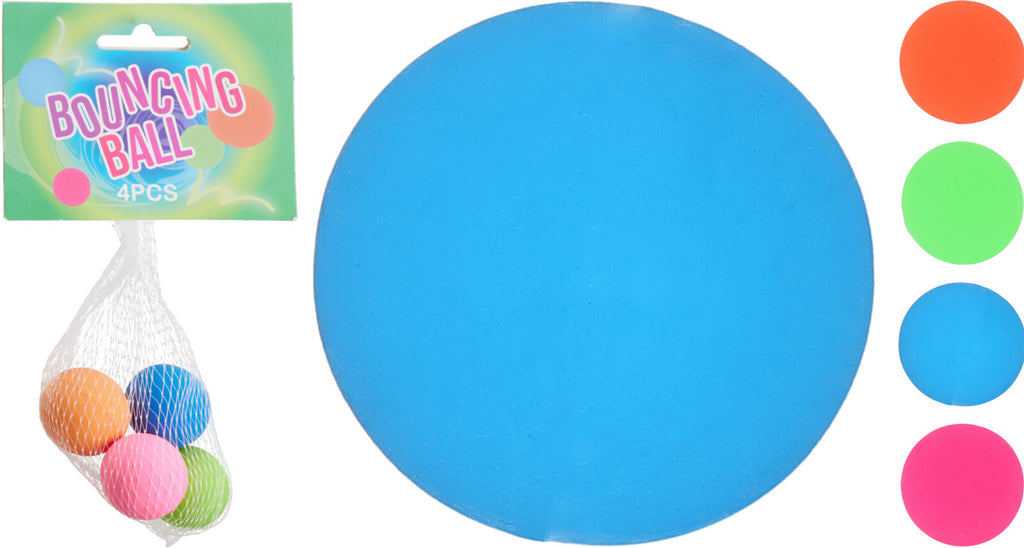 Set of four bouncy balls in vibrant green, blue, orange, and pink colours. Durable and fun for play, games, or activities. Compact pack ideal for gifts or personal use.