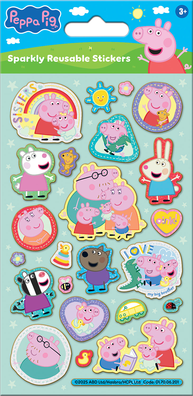 One sheet of reusable foiled stickers featuring your favourite characters from Peppa Pig and introducing her new sister Evie. Packaged with an illustrated backing board. Perfect for decorating books, folders, laptops, pencil cases, bikes, cards, and anything else you can think of!