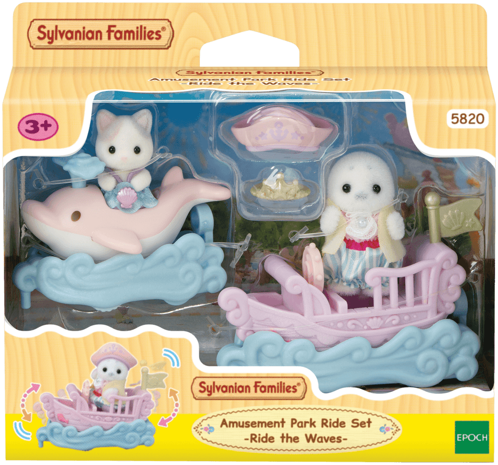 A set of amusement park rides with cute features, along with the Seal baby and Latte Cat cradled baby. The boat sways back and forth as it moves. The water from the dolphin's head moves up and down. The babies are wearing cute outfits that match each ride. The boat and dolphin can be connected.