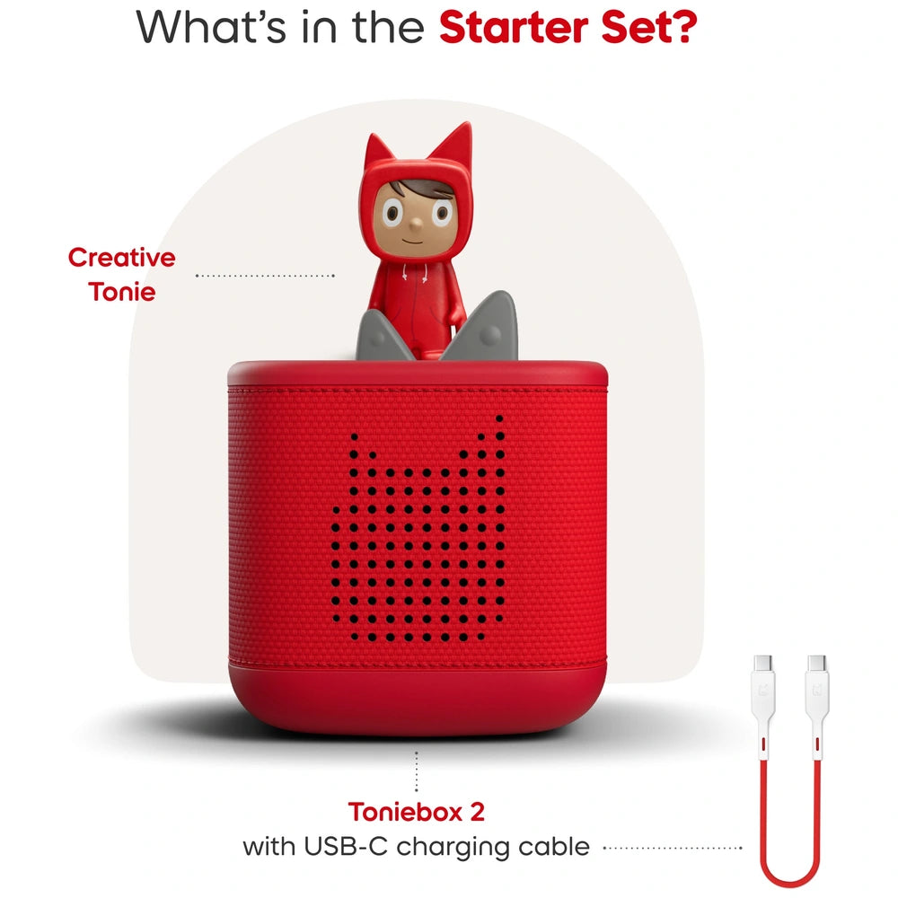 Contents: 1x Tonies Toniebox 2 in Sunset Red; 1x Creative Tonie Figure; 1x USB-C Charging Cable