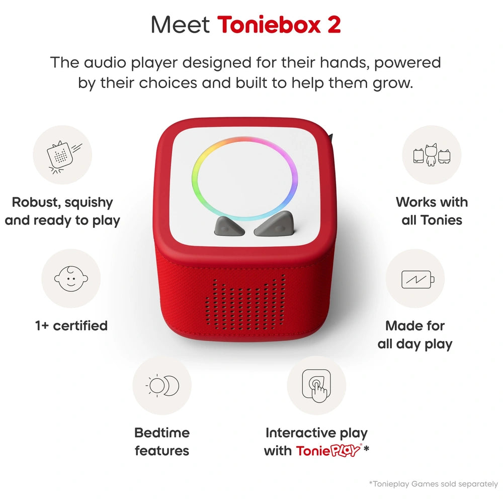 Meet Toniebox 2! The audio player designed for children's hands, powered by their choices and built to help them grow with screen-free stories, songs, games and more!