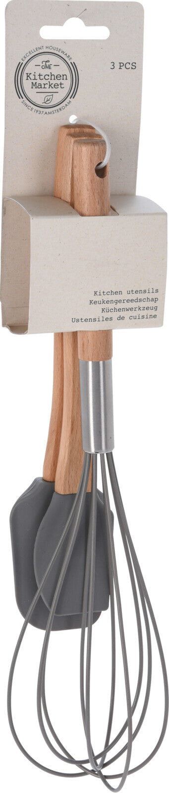 Make cooking a joy with this lovely 3-piece kitchen tool set featuring stylish grey silicone heads and warm beechwood handles!