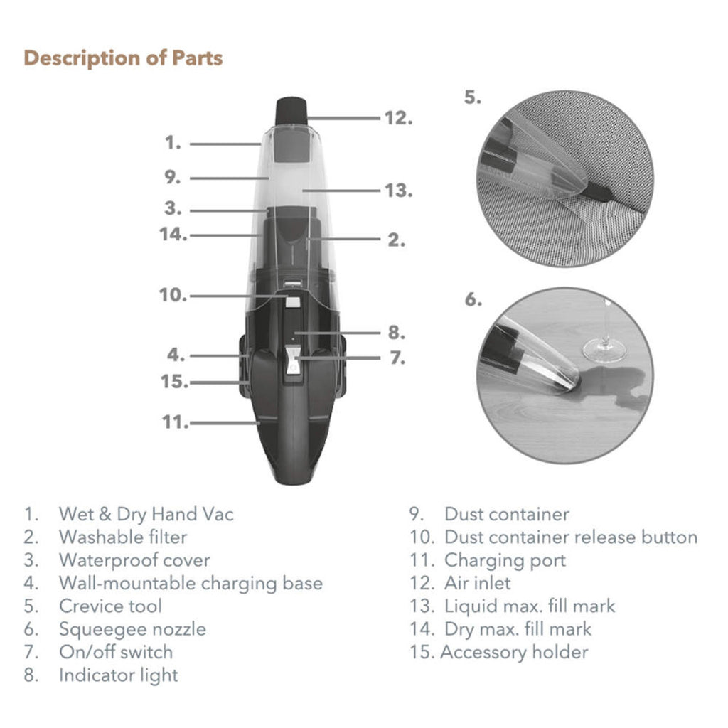 - The cleverly designed vacuum can be used on both wet and dry spills – a squeegee nozzle is included for easily cleaning up liquids.