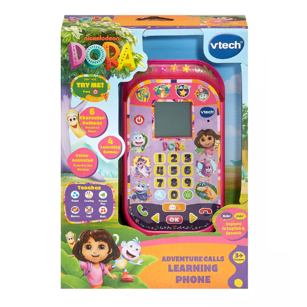 Adventure is calling on this colorful, light-up phone featuring Dora and her friends, with games and activities in English and Spanish Count boxes, stop Swiper from getting gifts, help Boots find shapes and remember and repeat the melody in four exciting games Play mini games with Dora and her friends to explore directions, shapes, counting, matching and more Call up Dora and she’ll respond when you chat with her on the phone; "Hola, soy Dora". This learning phone toy is great for preschoolers to explore pretend play, shapes, Spanish and more; makes an exciting unisex gift for holidays, birthdays or just because