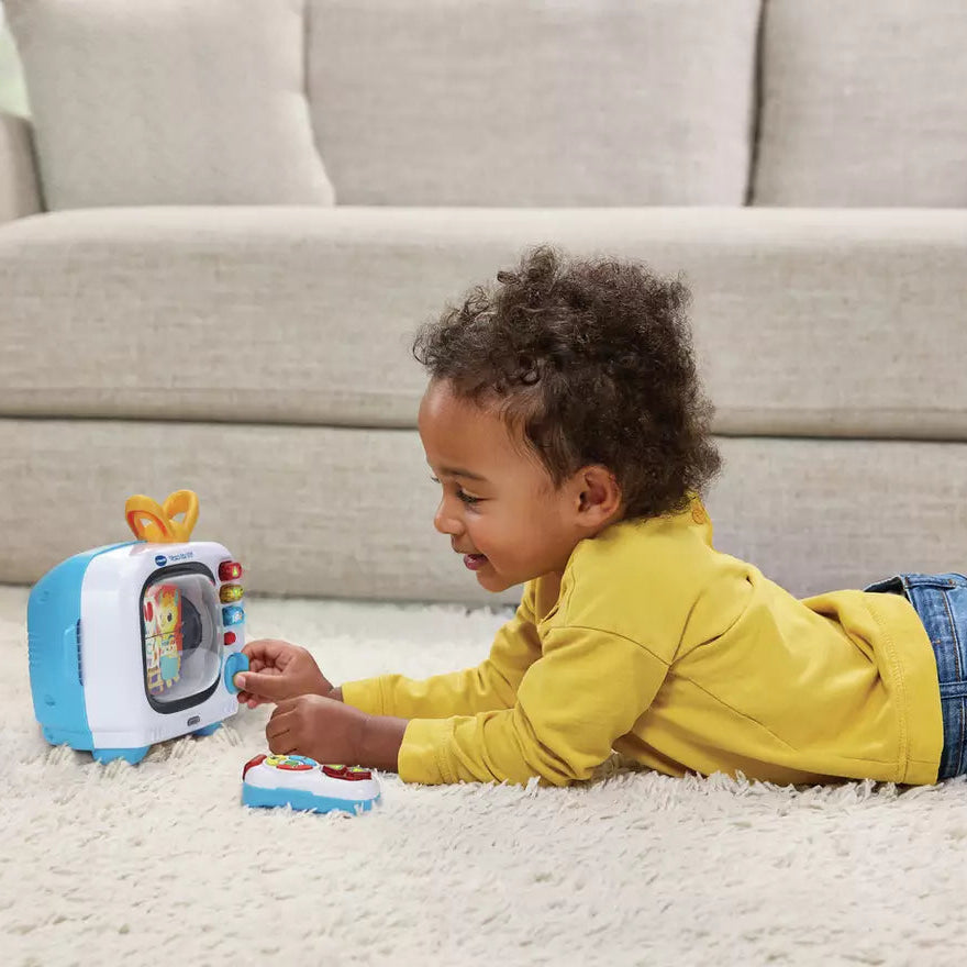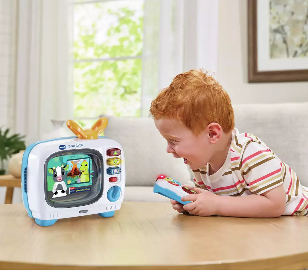 Watch and learn with the Tune In TV by Vtech. This retro-inspired television set features a spinning antenna carry handle and a detachable remote control. The 10 flip panel channels introduce learning topics such as letters, numbers, animals, weather, food, sports, French language and more! Use the included remote control to change learning channels one-by-one or by category (news, sports, entertainment). Press one of the 3 buttons on the Tune In TV to change channels or play music. Suitable for ages 12-36 months.
