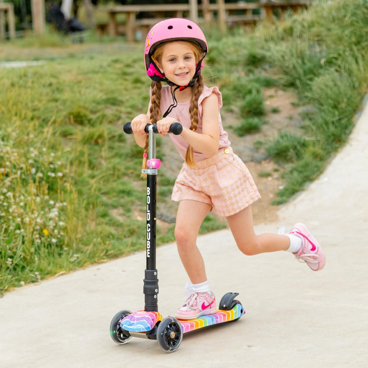 Our Rainbow 3 Wheel Foldable Scooter is designed with travel in mind. Whether you need to commute in style or to have fun outdoors, this is the perfect scooter for children 5 years and older. The lean to steer aspect of this scooter continues to nurture balance and stability in budding young kids. Featuring double stacked rear wheels for twice as bright flashing lights and a tough stomp brake, this foldable scooter stands out from the crowd without compromising on safety or functionality.