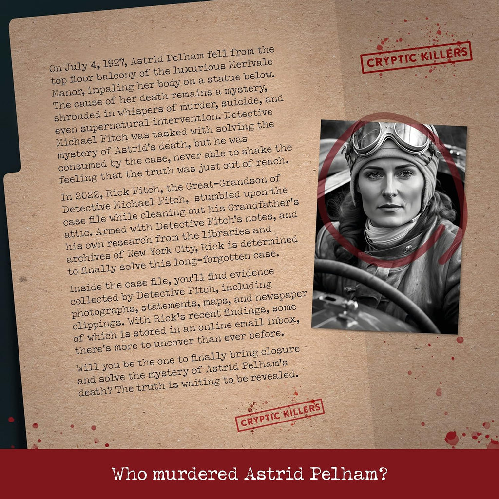 - BEST COLD CASE FILE GAME AVAILABLE - Murder at Merivale Manor - On July 4, 1927, Astrid Pelham fell from the top floor balcony of the luxurious Merivale Manor, impaling her body on a statue below. The cause of her death remains a mystery, shrouded in whispers of murder, suicide, and even supernatural intervention. Armed with new evidence, it’s your job to piece it all together and work out who it was that killed the victim.