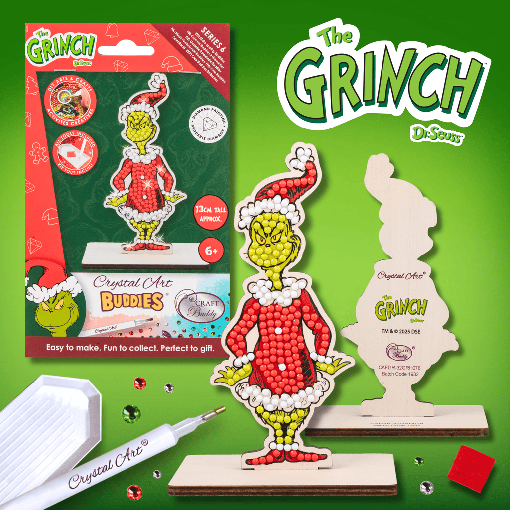 Discover 'The Grinch' Crystal Art® Buddies Kit from an exciting Series 6 range by Craft Buddy. Featuring the one and only green and mean character from the world of Dr. Seuss, he is dressed in his classic Santa suit and wearing his iconic smirk. This adhesive figurine is brought to life with colourful, shimmering gems you apply yourself, which is easy and fun to complete whatever age or level of crafter you are.