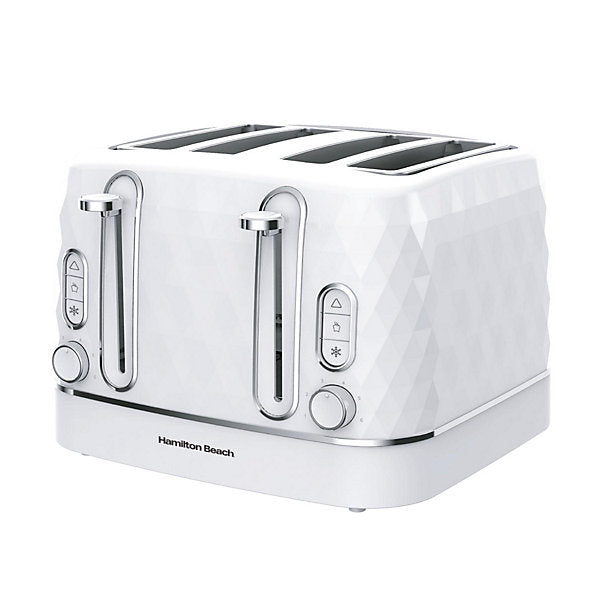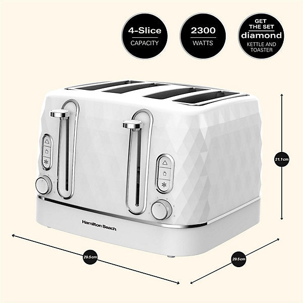 Elevate your kitchen with our premium 4-Slice Toaster, the perfect blend of style and functionality. Designed with a striking diamond-patterned body and polished chrome accents, this toaster adds a touch of sophistication to any countertop. With its generous 4-slice capacity, ideal for busy families or hosting guests, ensuring you can toast more in less time. The high lift feature makes retrieving smaller slices effortless, while the defrost, reheat, and cancel buttons provide convenient control over your toasting preferences. Plus, the easy-to-clean slide-out crumb tray ensures a mess-free kitchen. Upgrade your mornings with this sleek, efficient, and versatile toaster, designed to meet all your breakfast needs. Perfect for every home, the ultimate choice for a modern, clutter-free kitchen.