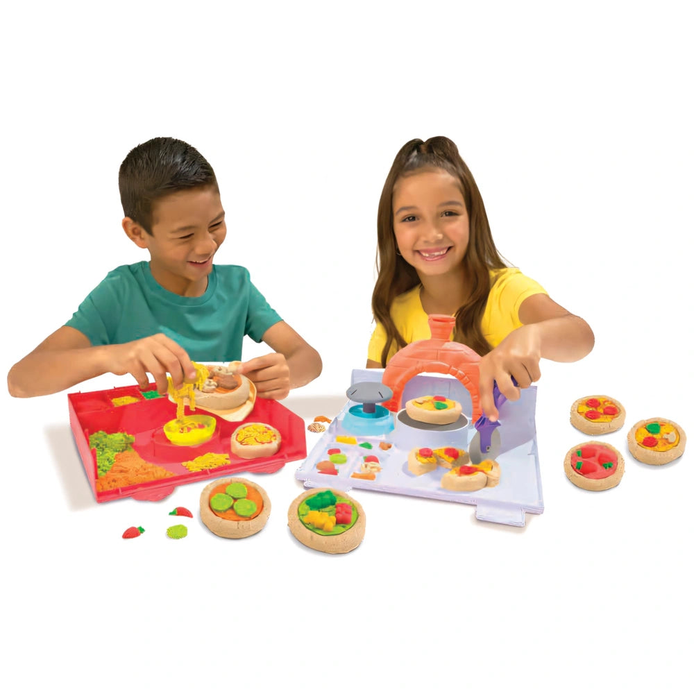 Shred cheese with the cutters handle, mix sand colours together, mould gummy bears and strawberries for a wacky pizza and more. SquishPizzas pizza box case keeps play contained and makes it easy to take the fun on the go. Kinetic Sand aids in the development of fine motor skills and sensory skills and is suitable for individual or group play, encouraging social interaction.