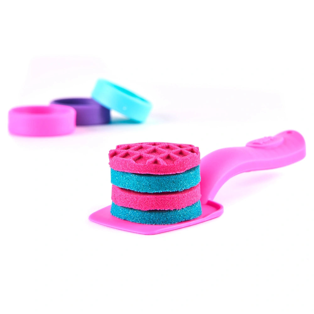 - Contents: 1x bag of shimmer Kinetic Sand, 1x bag of Neon Kinetic Sand, 1x spatula, 3x cookie stampers, 1x roller, 3x cupcake moulds, 11x accessories and 1x scene punch-outs