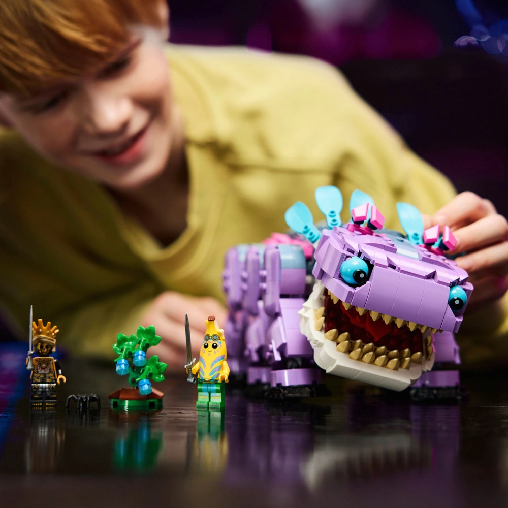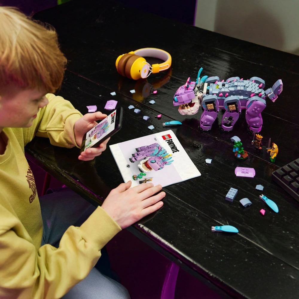 Fans and gamers build and befriend an iconic LEGO Fortnite character with the LEGO Fortnite 77077 Klombo Set! Players scan a QR code on the building instructions to redeem the Island Adventure Peely Outfit in the LEGO Fortnite video game. For added digital fun, builders can zoom in, rotate models in 3D and track their progress using the fun, intuitive LEGO Builder app. Klombo is a big creature from the LEGO Fortnite video game, and this building kit lets kids recreate him with LEGO bricks. They'll have fun building the Fortnite video game toy before discovering all the cool details, including his movable legs, opening mouth and rotating tail. The set also includes a small Klomberry bush with detachable Klomberries so kids can act out agitating Klombo to make him mad before feeding him Klomberries to make friends. It also includes minifigures of Island Adventure Peely and Oro, who attach to the back of Klombo to encourage imaginative role play.