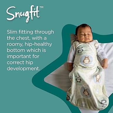 The Swaddlebags have been designed to be snug up top and wriggly down below - slim fitting through the chest to enable full freedom of movement without restriction or excess bulk with a roomy, hip-healthy bottom to allow your baby to adopt a natural “frog-legged” sleeping position, which is important for correct hip development.