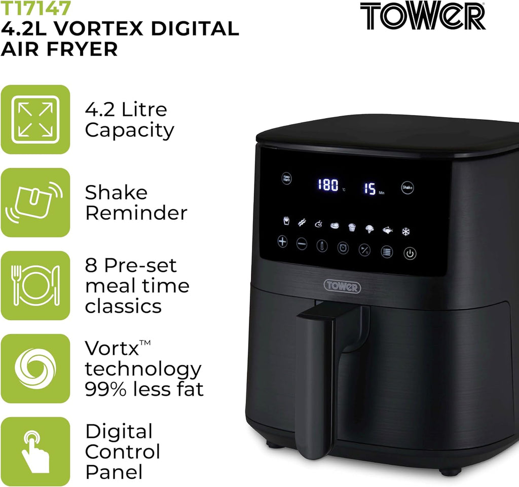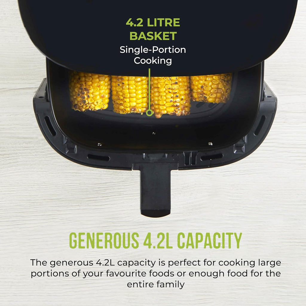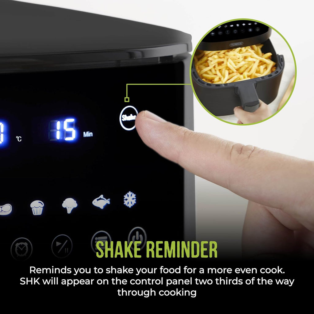 A large capacity basket lets you cook enough larger portions of the food you love, with 8 pre-set cooking options to add a bit of variety to mealtimes. The letters SHK will appear on the display two thirds of the way before cooking, reminding you to shake the basket for a more thorough and even cook. A non-stick removable grill plate allows for simple cleaning so cooking is fuss-free from start to finish. The cable can be tucked under the appliance when not in use for easy storage
